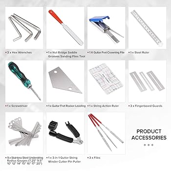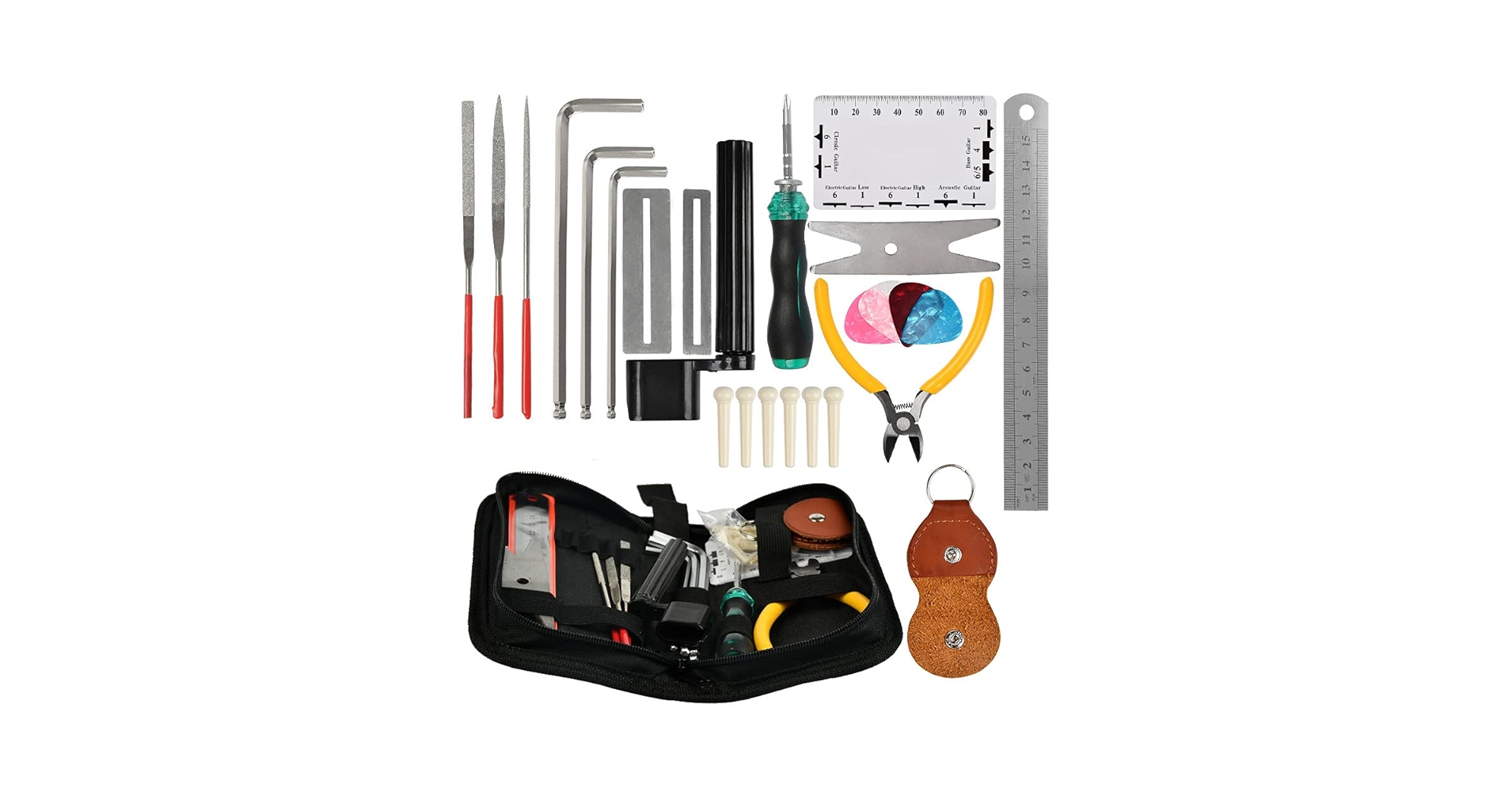 Gitarrenreparatur-Werkzeug-Set (26 Stück) Drahtzange, Saiten-Organizer, Griffbrettschutz, Sechskantschlüssel, Feilen, Saitenlineal Action Linuler, Schraubenschlüssel, Mandoline, Banjo