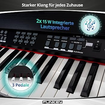 Für noch mehr Anschlussmöglichkeiten sorgt die MIDI-In/Out-Schnittstelle. Dieses Digital-Keyboard eignet sich ideal für das tägliche Üben, kreative Arrangements oder spontane Sessions im Wohnzimmer. Damit lässt sich das Midi-Klavier problemlos mit weiteren Keyboards, Soundmodulen oder externen Sequenzern verbinden. Kreativ üben und musizieren mit durchdachten Lernfunktionen Dieses MIDI-Piano unterstützt den musikalischen Fortschritt mit cleveren Funktionen, die ideal für Schüler, Einsteiger und Hobbymusiker geeignet sind. Mit insgesamt 360 verschiedenen Sounds bietet dieses Midi-Klavier von klassischen Piano-Voices über Orgeln bis zu modernen Synthesizer-Tönen eine große Auswahl an Klängen. Mit der Dual- und Split-Funktion lassen sich zwei verschiedene Klänge gleichzeitig spielen oder die Tastatur in zwei Zonen für Bass und Melodie aufteilen. Mit dem eingebauten MP3-Player können Sie Ihre Lieblingslieder abspielen und direkt dazu mitspielen, was die musikalische Praxis und Spielfreude fördert. Der integrierte Lernmodus bietet drei Schwierigkeitsstufen für beide Hände und zeigt die Noten direkt auf dem Display an. Durch die Kombination aus Tastenanzahl, Klangvielfalt und solider Audioausgabe bietet dieses E-Klavier mit zuverlässiger Technik und überzeugendem Sound einen praxisnahen Einstieg in die Welt des Musizierens. Ergänzt wird dieser Modus durch 80 inspirierende Demo-Songs, die das Üben abwechslungsreich gestalten. FunKey Digitalpiano »DP-88 II E-Piano Set Mit 88 Anschlagsdynamische Tasten 360 Sounds 160 Styles Usb Anschluss Mit Mp3 Player Lernfunktion Record Playback Funktion Economy Set Inkl Keyboardbank Kopfhoerer Und Klavierschule S0p2x0zf Der Kopfhörerausgang ermöglicht für konzentriertes Üben ein ungestörtes Spielen zu jeder Tageszeit. Mit 88 anschlagdynamischen Tasten und 128-stimmiger Polyphonie holt dieses Klavier das Beste aus dir heraus. Es verfügt über alle Funktionen, die du brauchst, um wunderschöne, einzigartige Musikstücke zu kreieren - vom Erlernen von Noten und Akkorden bis hin zum Komponieren ganzer Symphonien Die zwei integrierten Lautsprecher mit je 15 Watt Leistung sorgen für einen ausgewogenen, kräftigen Klang im ganzen Raum. Das integrierte Metronom hilft dabei, ein sicheres Taktgefühl zu entwickeln und präzise zu spielen. Keyboardbank mit kompakten Abmessungen, dynamischer Kopfhörer mit Aktiv-Bass, Klavierschule für Anfänger Eine Besonderheit des MIDI-Keyboards ist die umfangreiche Begleitautomatik mit 160 verschiedenen Styles von Pop und Rock hin zu klassischen Rhythmen. Dank 128-facher Polyphonie werden auch schnelle Passagen und komplexe Akkorde sauber wiedergegeben. FunKey Dgtalpano »DP-88 E-Pano Set mt 88 anschlagsdynamsche... Funkey DP-61 II Digitalpiano mit Ständer Keyboardbank, Kopfhörer und Klavierschule Integrierte Stereo-Lautsprecher, Abmessungen (BxTxH): 135 x 39 x 77,5 cm, Gewicht: 29,4 kg, Farbe: weiß Für alle, die auf komfortable, moderne Weise genau hören wollen, wie sie sich verbessern. • 88 anschlagdynamische Tasten • 128-fache Polyphonie • 360 Sounds • 80 Demo-Songs • 160 Begleit-Styles • Lernmodus mit drei Schwierigkeitsstufen • Dual- und Split-Funktion • Metronom • Record-&-Playback-Funktion • MP3-Player • Kontrastreiches LCD-Display • 2× 15 W integrierte Lautsprecher • 3 Pedale • Kopfhörerausgang • USB to Host • USB to Device • MIDI In/Out • Maße: 135 × 39 × 77,5 cm • Gewicht: 29,4 kg • Farbe: Weiß • Aufbauzeit: ca. 15 Minuten Das Digital-Keyboard ermöglicht ein spielerisches Lernen mit schnellen Erfolgserlebnissen und ist eine durchdachte Wahl für alle, die sich musikalisch weiterentwickeln möchten. Aufnehmen, begleiten, perfektionieren – für kreatives Musizieren Unser elektronisches Piano bietet alles, was Sie für ein effektives und vielseitiges Üben benötigen. Dieses Midi-Klavier ist nicht nur ein leistungsstarkes Übungsinstrument, sondern unterstützt Sie auch bei kreativen Projekten, Playback-Aufnahmen und täglichen Spielroutinen. Das Funkey Digital-Keyboard passt sich jeder Anforderung an, egal ob für private Musikprojekte, Online-Unterricht oder den Live-Einsatz. Flexible Anschlüsse für jedes Einsatzgebiet – vom Heimstudio bis zur Bühne Dieses Digital-Piano ist nicht nur ein vielseitiges Instrument, sondern auch hervorragend vernetzt.