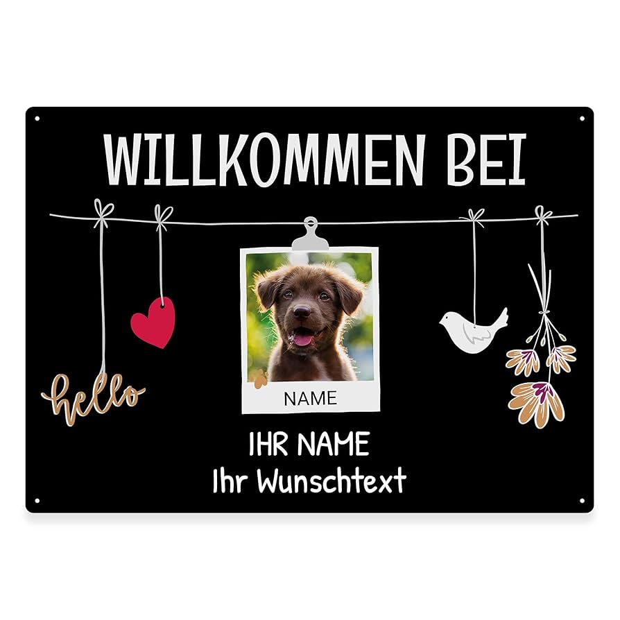 Gestalte Deine Gedenktafeln mit Deinen Lieblingsfotos bedruckt in brillanter Druckqualität in unserer hauseigenen Produktion Made in Germany. Material: Aluminium - Stärke 1,15 mm - besonders stabil und kratzfest - mit Anti-Graffiti-Coating - Maße: 21 x 15 cm im Querformat - enspricht DIN A5 - Outdoorschild inklusive 4 Bohrlöchern zum Anbringen an Türen und Wänden Gestalte Deine eigene Leckerlidose mit Deinen Lieblingsfotos bedruckt in brillanter Druckqualität in unserer hauseigenen Produktion Made in Germany. Fußmatte Her Wohnt En Hund Mt Senem Personal Fußmatte Geschenk Hundebestze, Trendaton, für... Seien Sie kreativ und gestalten Sie nach Wunsch Ihr personalisiertes Namensschild mit Hundefoto für das Gartentor, die Garage oder die Wohnungstür - je nach Einsatz - besonders für den Outdoorbereich. Gestalte Dein eigenes Fotokissen mit Deinen Lieblingsfotos bedruckt in brillanter Druckqualität in unserer hauseigenen Produktion Made in Germany. Ein selbst gestaltetes Türschild ist ein persönliches und praktisches Geschenk für Freunde einem Hund oder mehreren Hunden zum Umzug oder Einzug, zur Wohnungseinweihung oder für den Garten als Mitbringsel zum Geburtstag, zu Weihnachten und zu jedem Anlass. Achtung Hund Schild Hunde Schild Personalisiert - Hier Wohnt Mit Personal - Metallschild Mit Foto Und Name Für Außen, Wetterfestes Türschild Für Hundebesitzer - DIN A5-21 X 15 Cm, Zwei Tiere, Schwarz Hundeschild Personalisiert Metallschild Hier wohnt ein Hund mit seinem Personal - Jetzt kaufen und deine Wohnung... Schild Spruch Keep Calm and go to the Irish Pub 20 x 30 cm Blechsch, 9,99